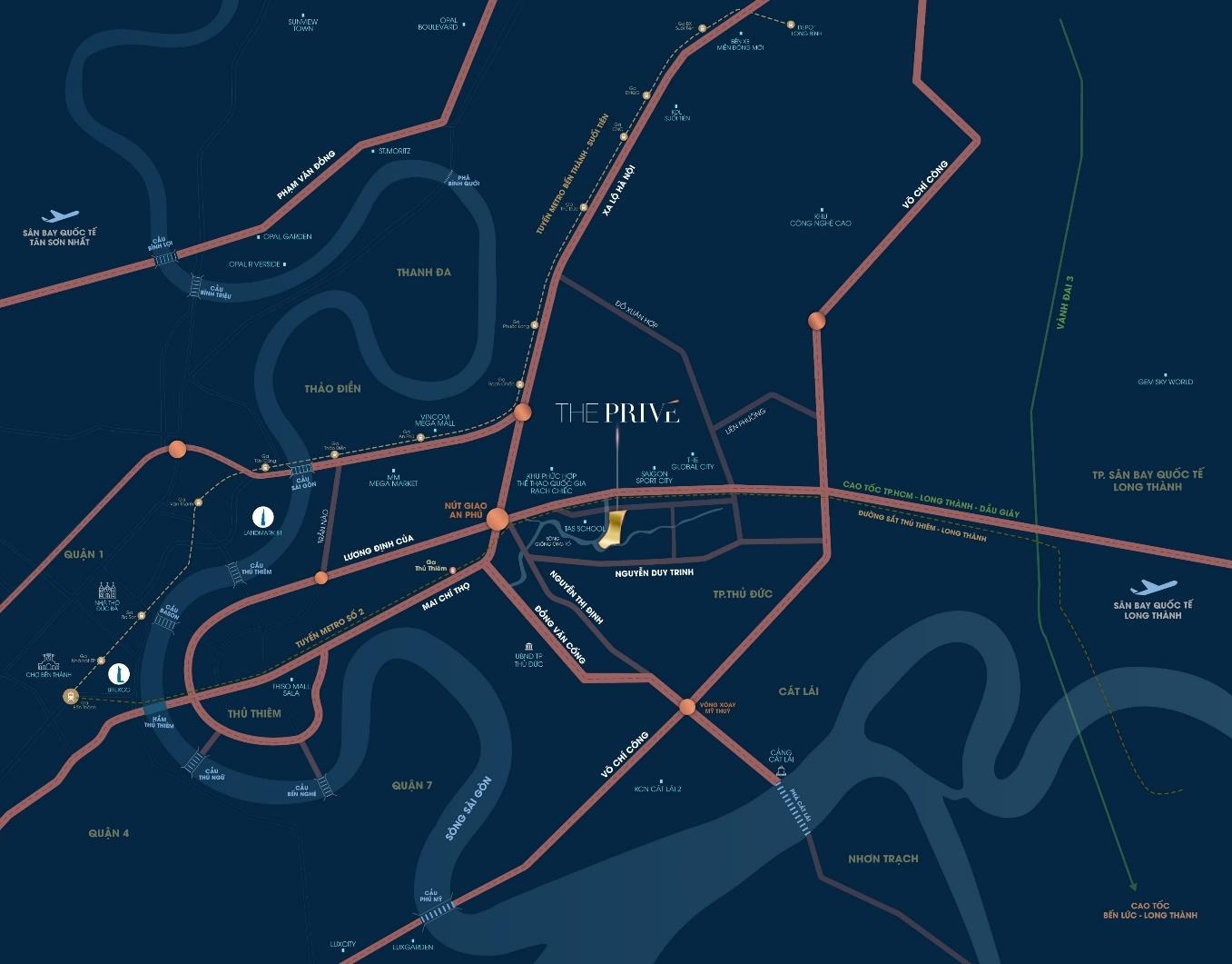 Quận 1 → Hầm Thủ Thiêm → nút giao An Phú → đường song hành cao tốc TPHCM – Long Thành → Nam Rạch Chiếc → The Prive.