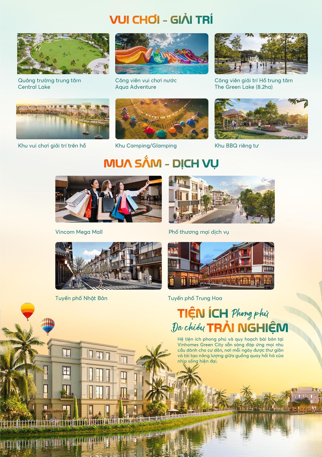 Không chỉ chú trọng vào việc xây dựng các tòa nhà cao tầng, Vinhomes Green City còn đặc biệt quan tâm đến việc phát triển hệ thống tiện ích đồng bộ và đẳng cấp. Các tiện ích trong dự án được bố trí hài hòa, giúp cư dân có thể tận hưởng cuộc sống tiện nghi và thư giãn ngay trong khuôn viên dự án.